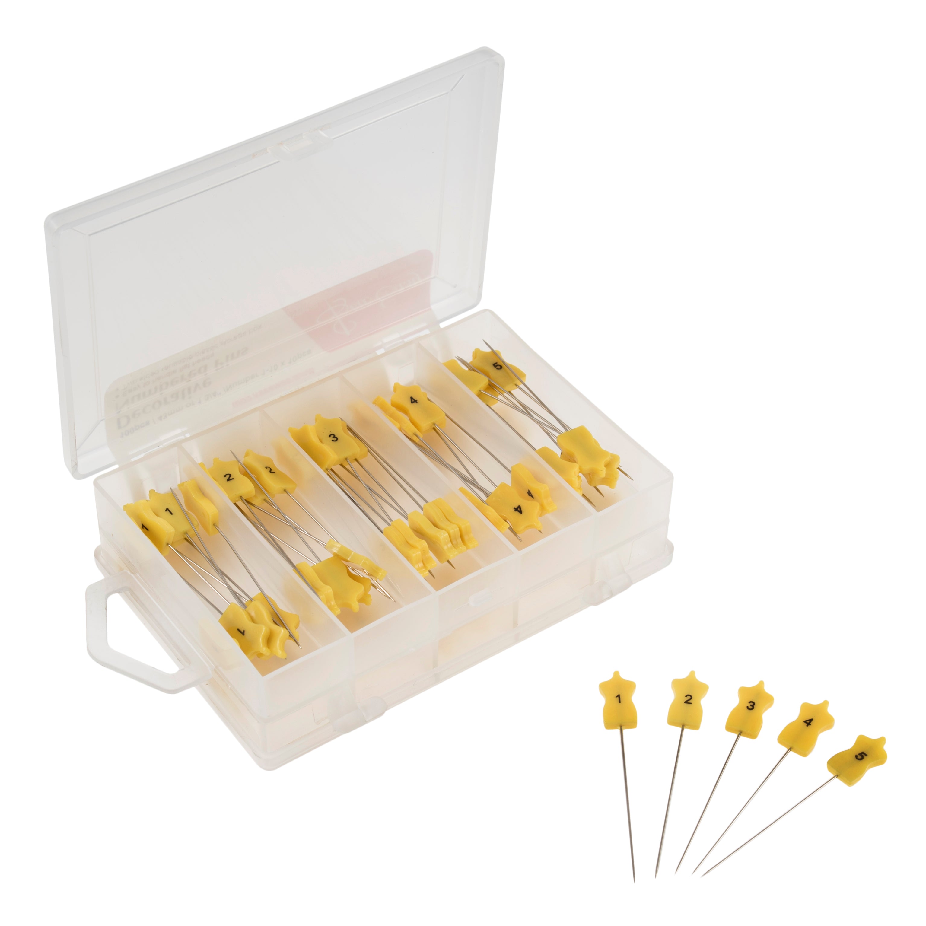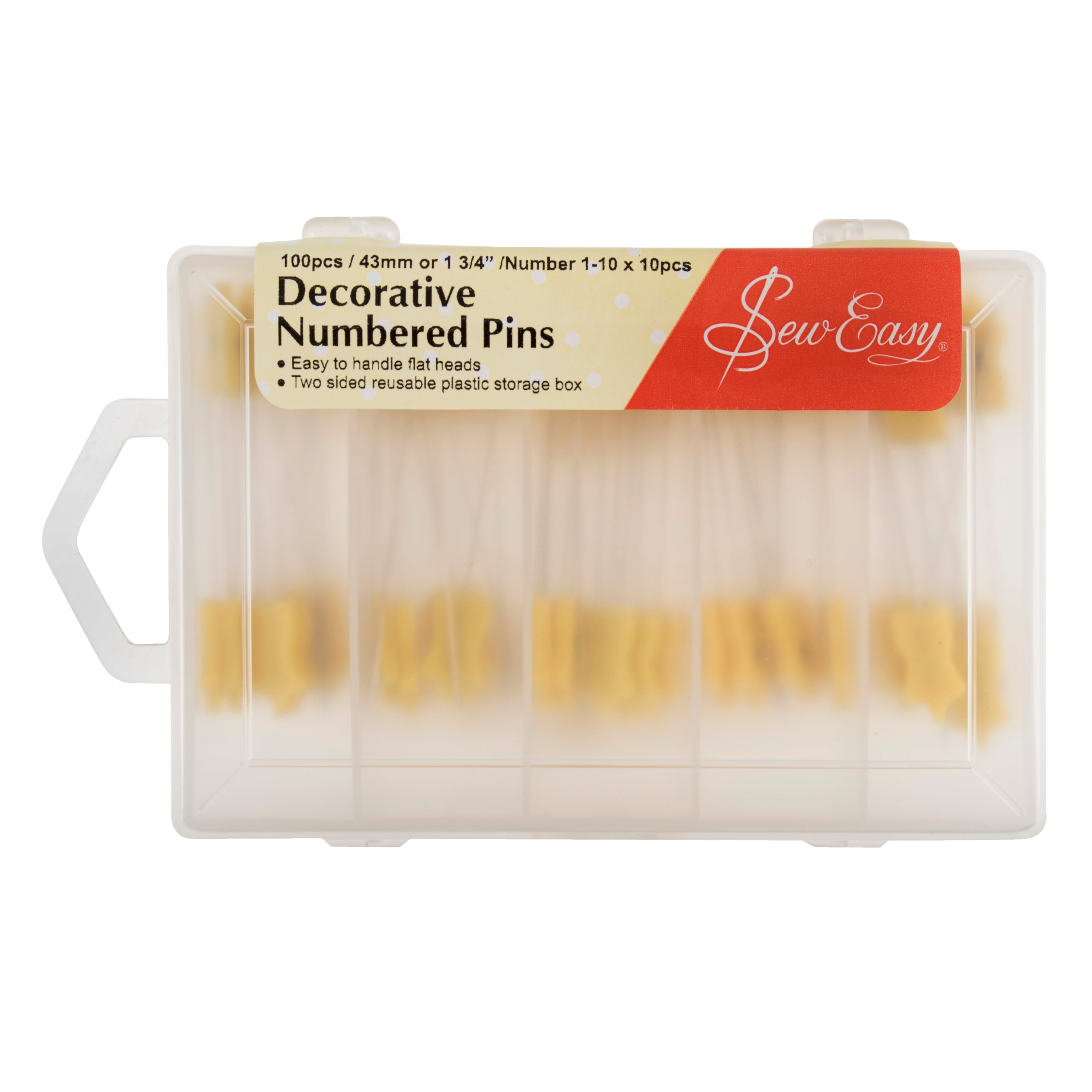- Easy to handle flat headed pins inside a compartmentalized two sided reusable plastic storage box.