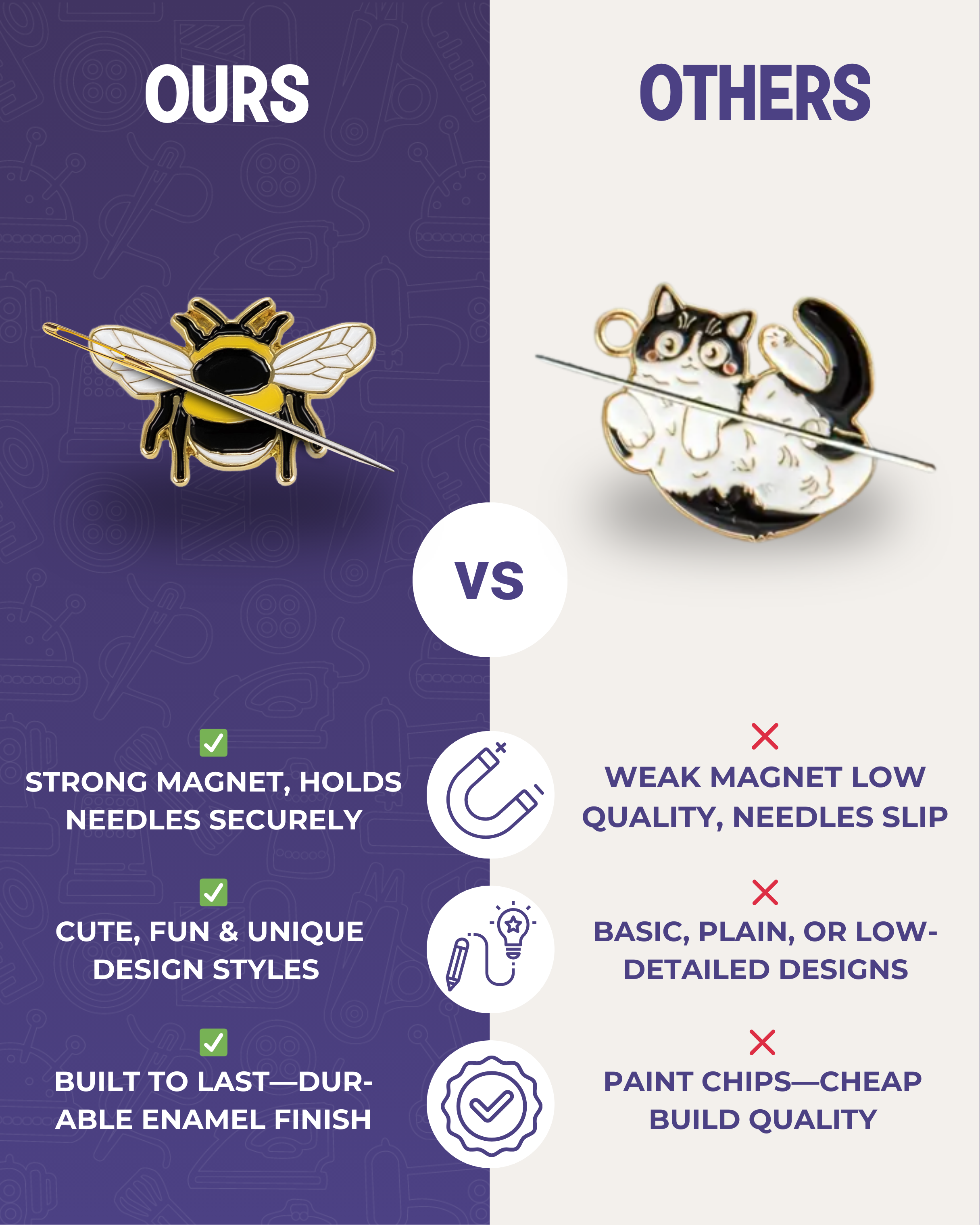 - The enamel sewing needle holder is easily secured to your fabric or embroidery kit. The minder attaches to the front of your fabric with one magnet and secures behind with another.