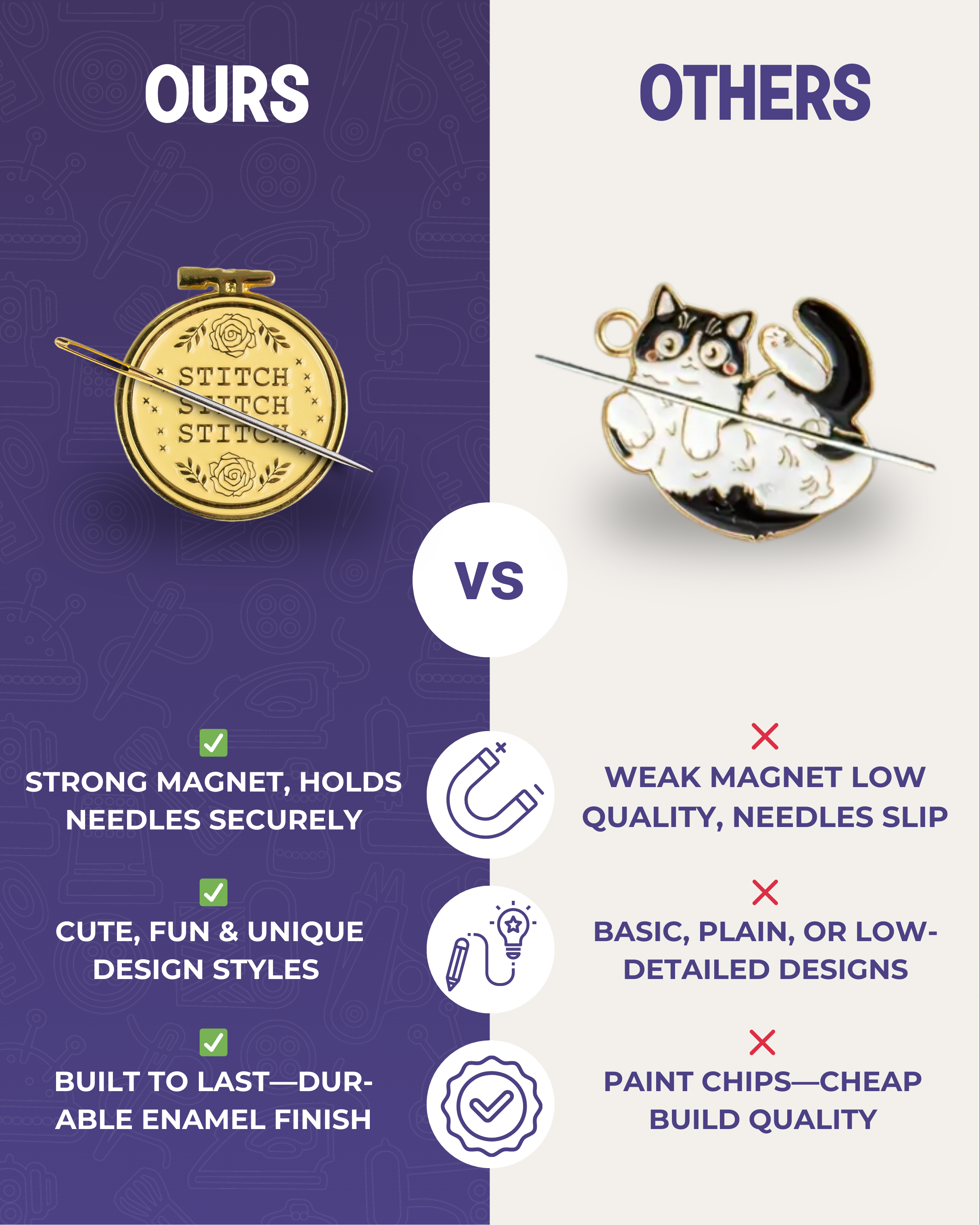 - The enamel sewing needle holder is easily secured to your fabric or embroidery kit. The minder attaches to the front of your fabric with one magnet and secures behind with another.