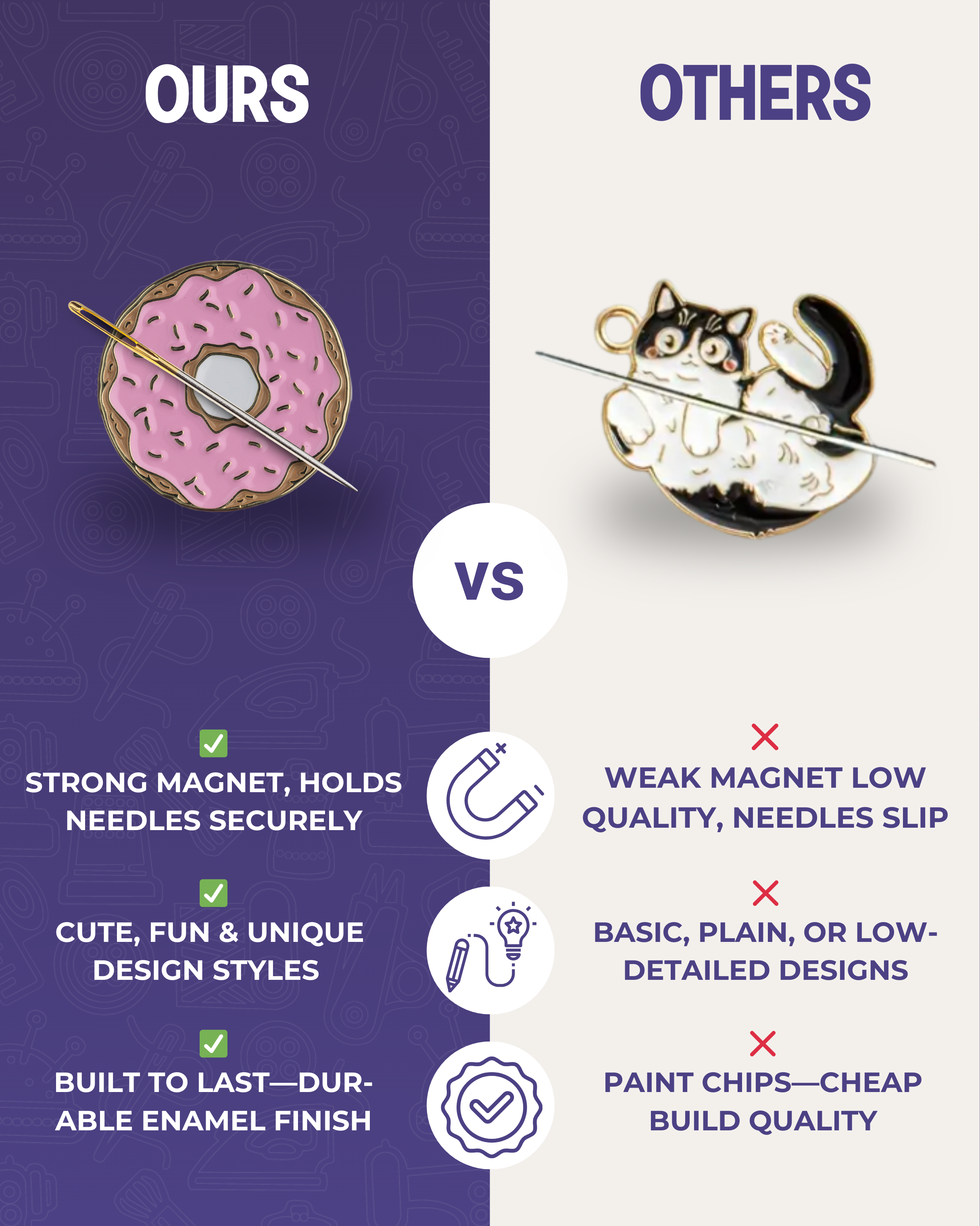 - We have a range of 8 stylish designs to choose from - from red roses to delicious donuts! Our needle minders are sure to make your sewing kit stand out.