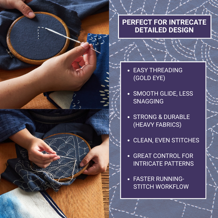 - Premium Gold Eye Sashiko Needles: Our gold eye sashiko embroidery needles for sewing are crafted for precision and durability. Ideal for traditional Japanese stitching, they combine the finesse of an embroidery needle with the ease of use of sewing needles large eye.