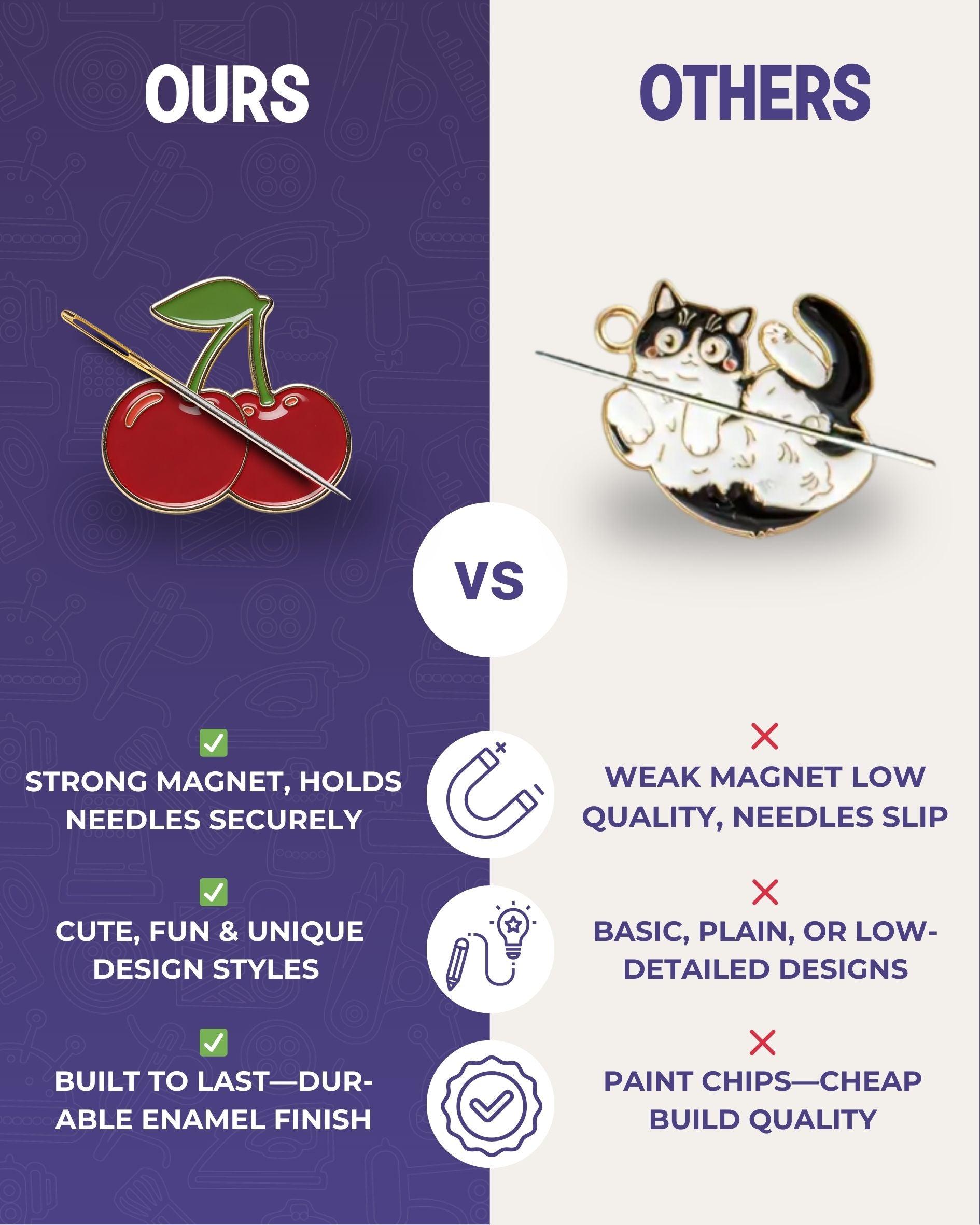 • The enamel sewing needle holder is easily secured to your fabric or embroidery kit. The minder attaches to the front of your fabric with one magnet and secures behind with another.