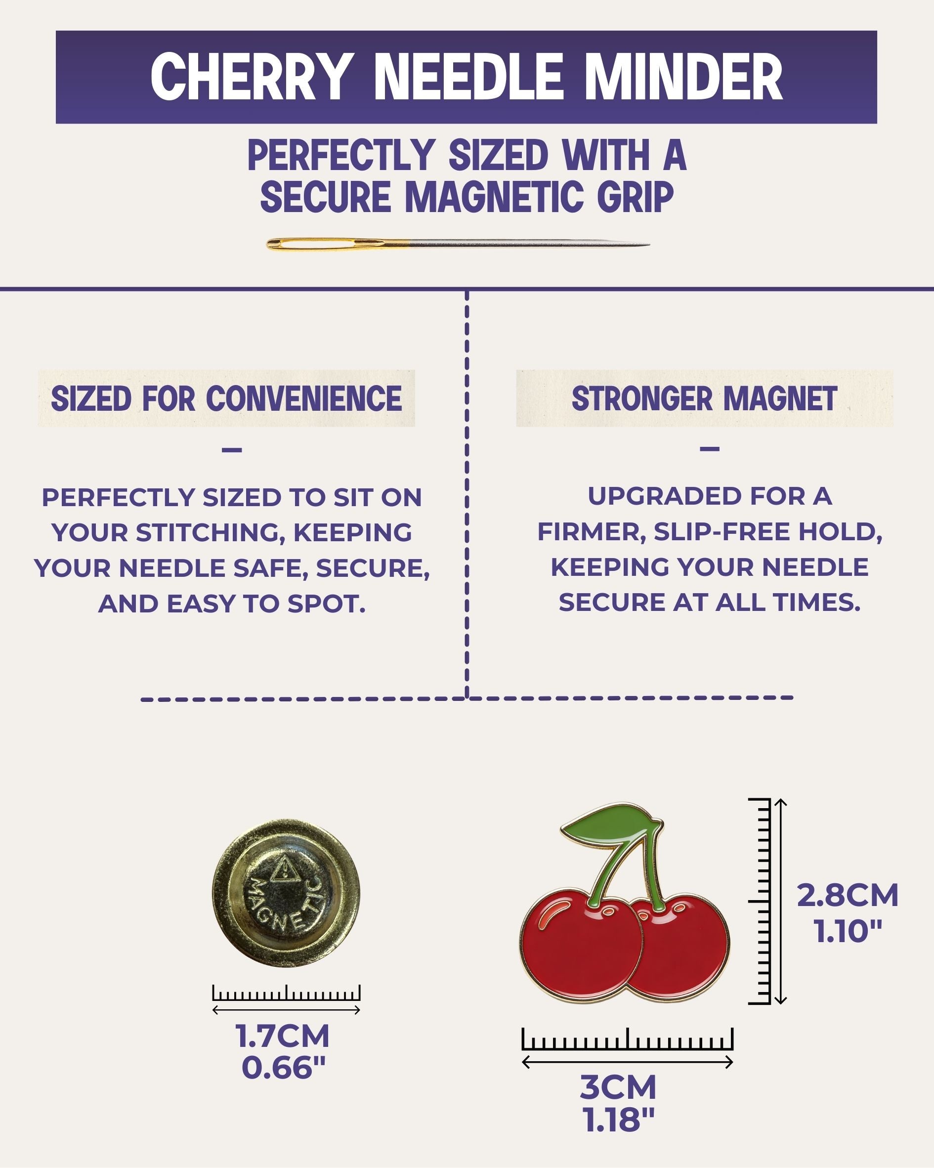 • Featuring our newly redesigned larger magnet with over twice the strength of our previous generation - whether changing thread colours or simply taking a break - this needle minder stays exactly where you placed it.