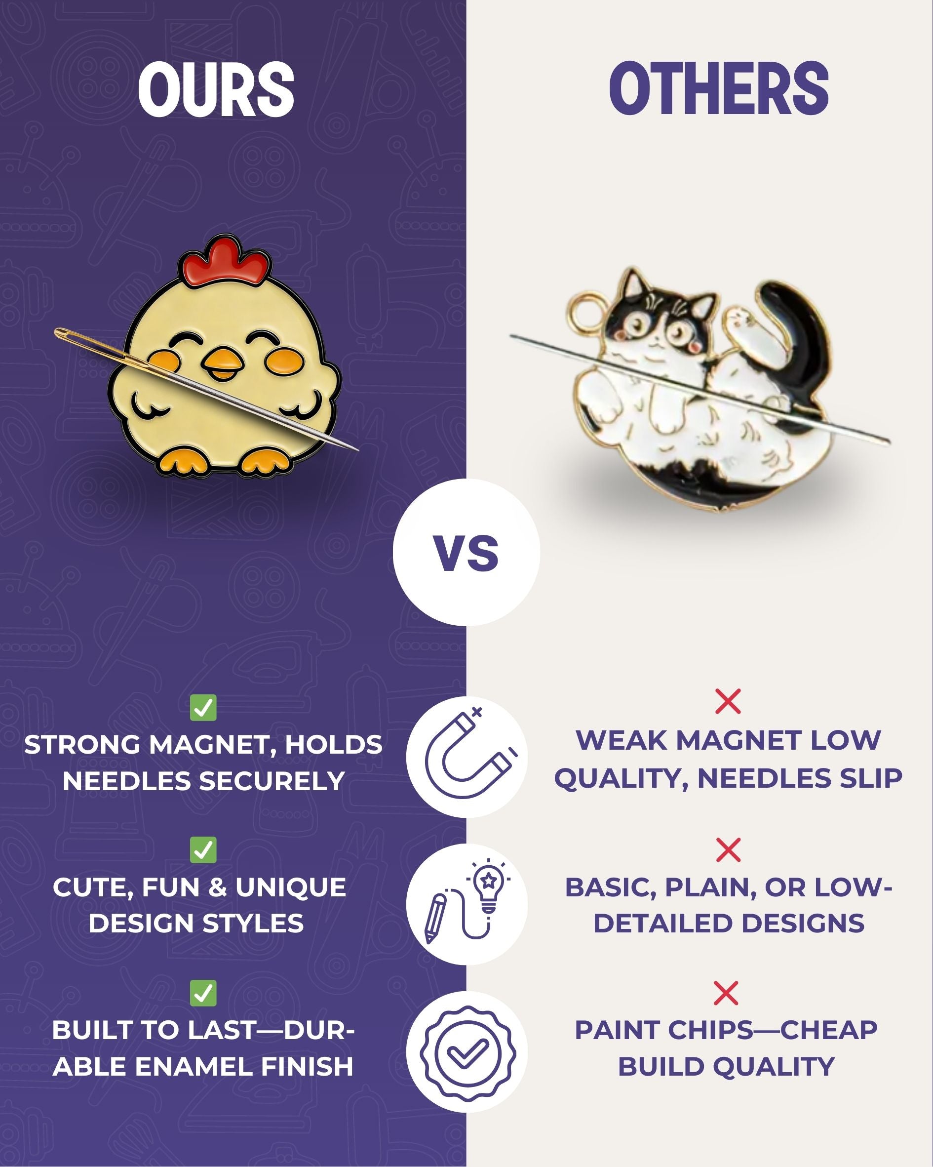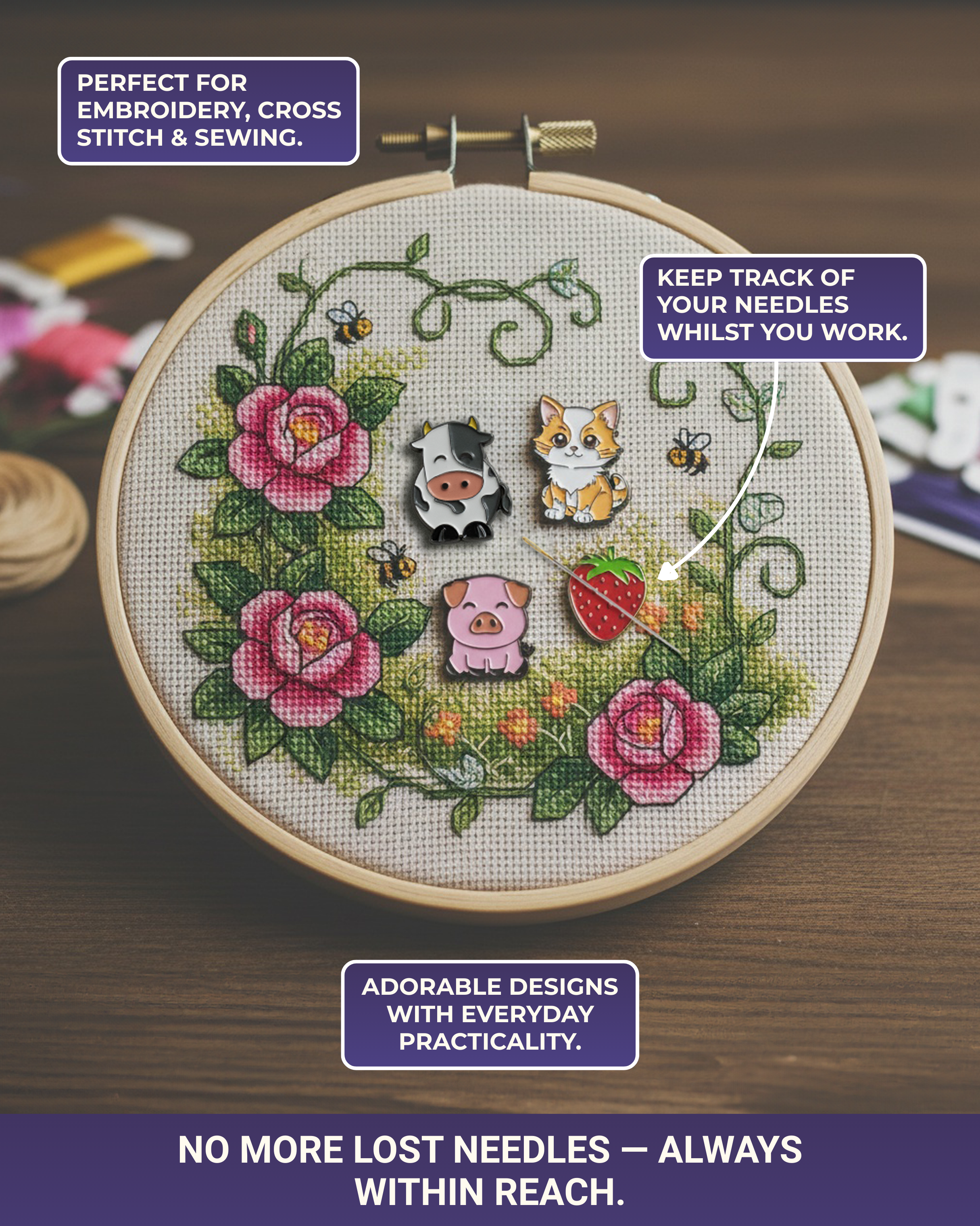 • The enamel sewing needle holder is easily secured to your fabric or embroidery kit. The minder attaches to the front of your fabric with one magnet and secures behind with another.