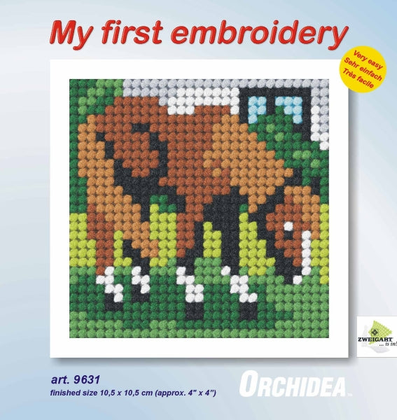 - Beginners needlepoint kit, worked in half stitch on Zweigart, printed, 6.5 count canvas. Kit contains acrylic yarn, needle, and instructions. Finished size: 10.5 x 10.5cm, (4 x 4in).