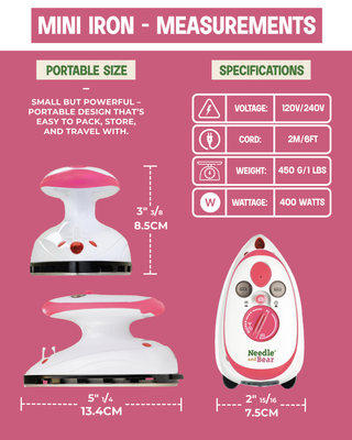 Needle and Bear - Premium Mini Steam Iron with Hardshell Travel Case & Iron Rest (Pink Case)