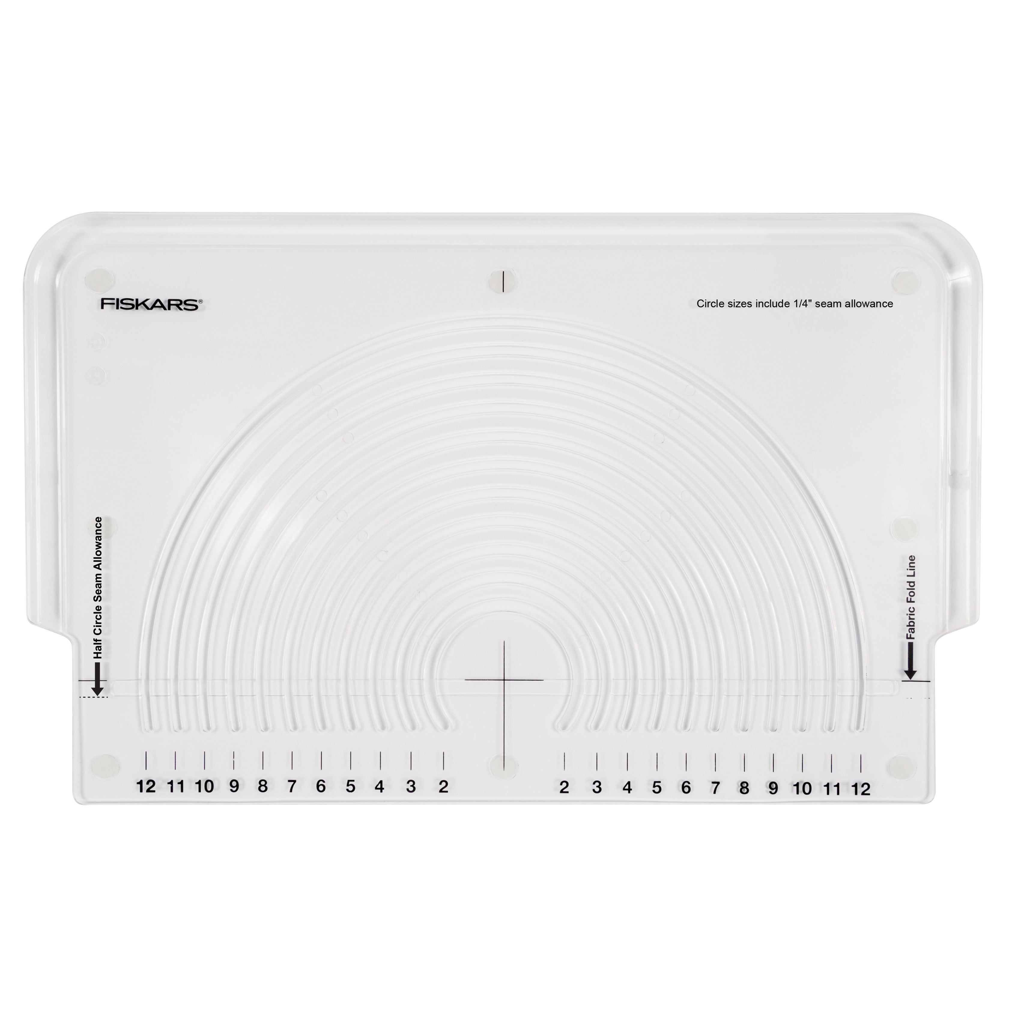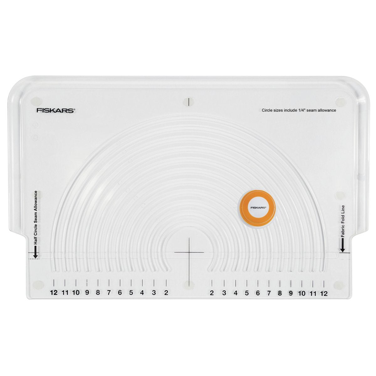 Cuts perfect, consistent fabric circles. ¼in seam allowance. Can create circles from 2 - 12 inch. Half-fold design eliminates pinholes and need for tracing. Push cutter handle rotates for smooth cutting without twisting or reaching. Softgrip helps reduce hand fatigue and increase comfort. Template's bottom lip and grips help keep fabric in place. Lifetime warranty.