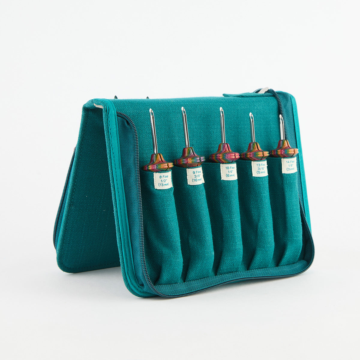 - In a sturdy cotton stand-up zippered tool case with seven pockets in Midnight Teal.