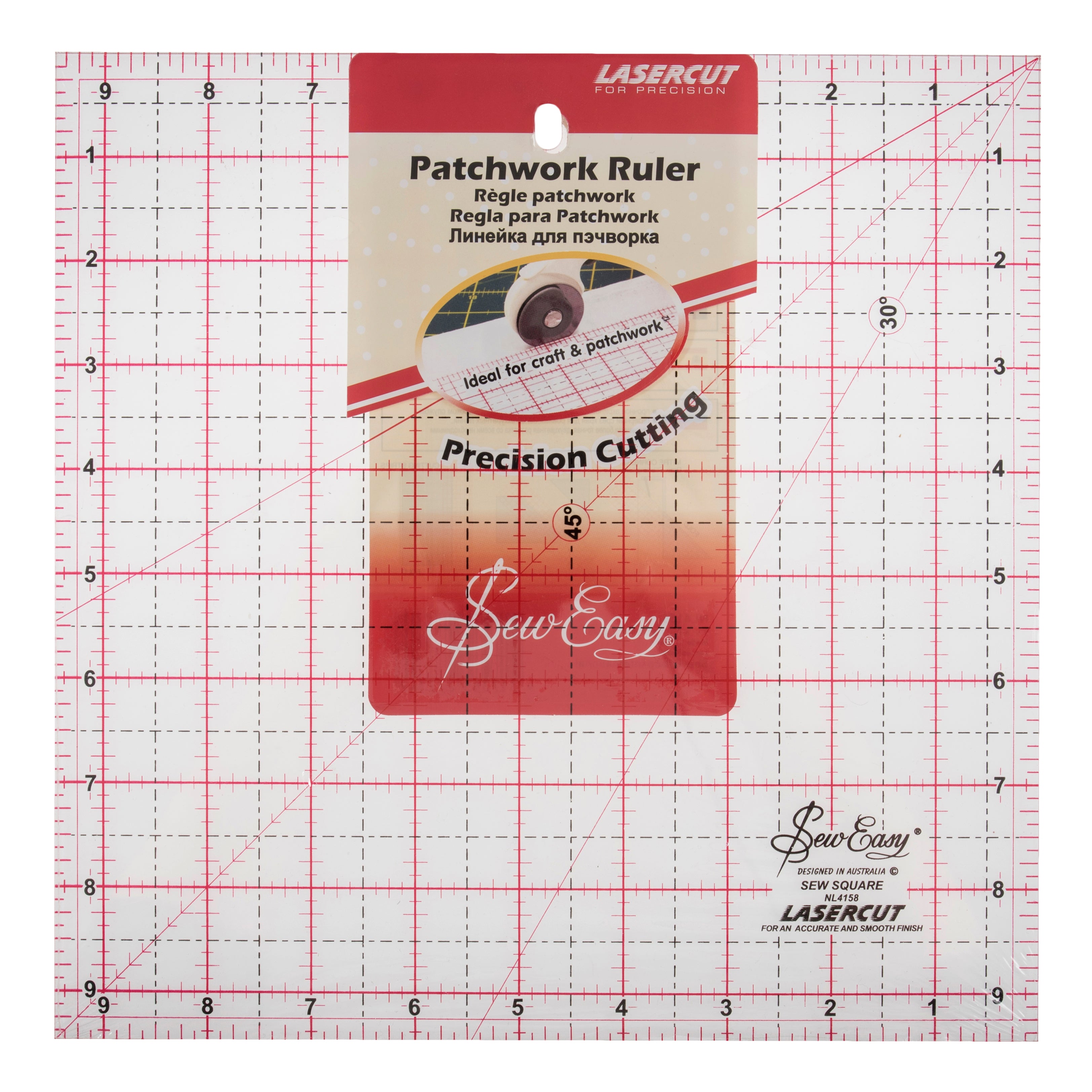 - A medium sized ruler, ideal for cutting squares up to 9.5 ", blocks, half-squares and quarter-square triangles.