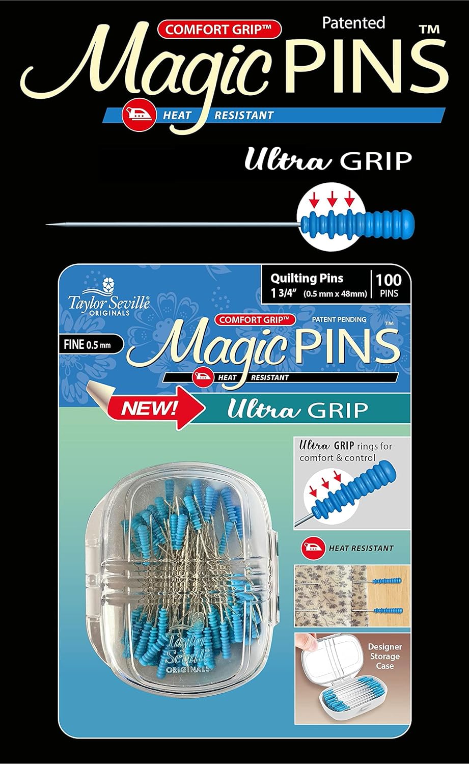 Ultra Grip, Heat Resistant, 100pc. Taylor Seville Originals Notions make your sewing life easier. The Ultra Grip Magic Pins are 1.75in x 0.5mm. They have a comfort grip head that makes picking up and maintaining a grip on the pin, easy. The Comfort Grip Magic Pins are also heat resistant, so if you iron over them, they will not be ruined. The pins come in a designer storage case that closes, so you won’t lose any pins!