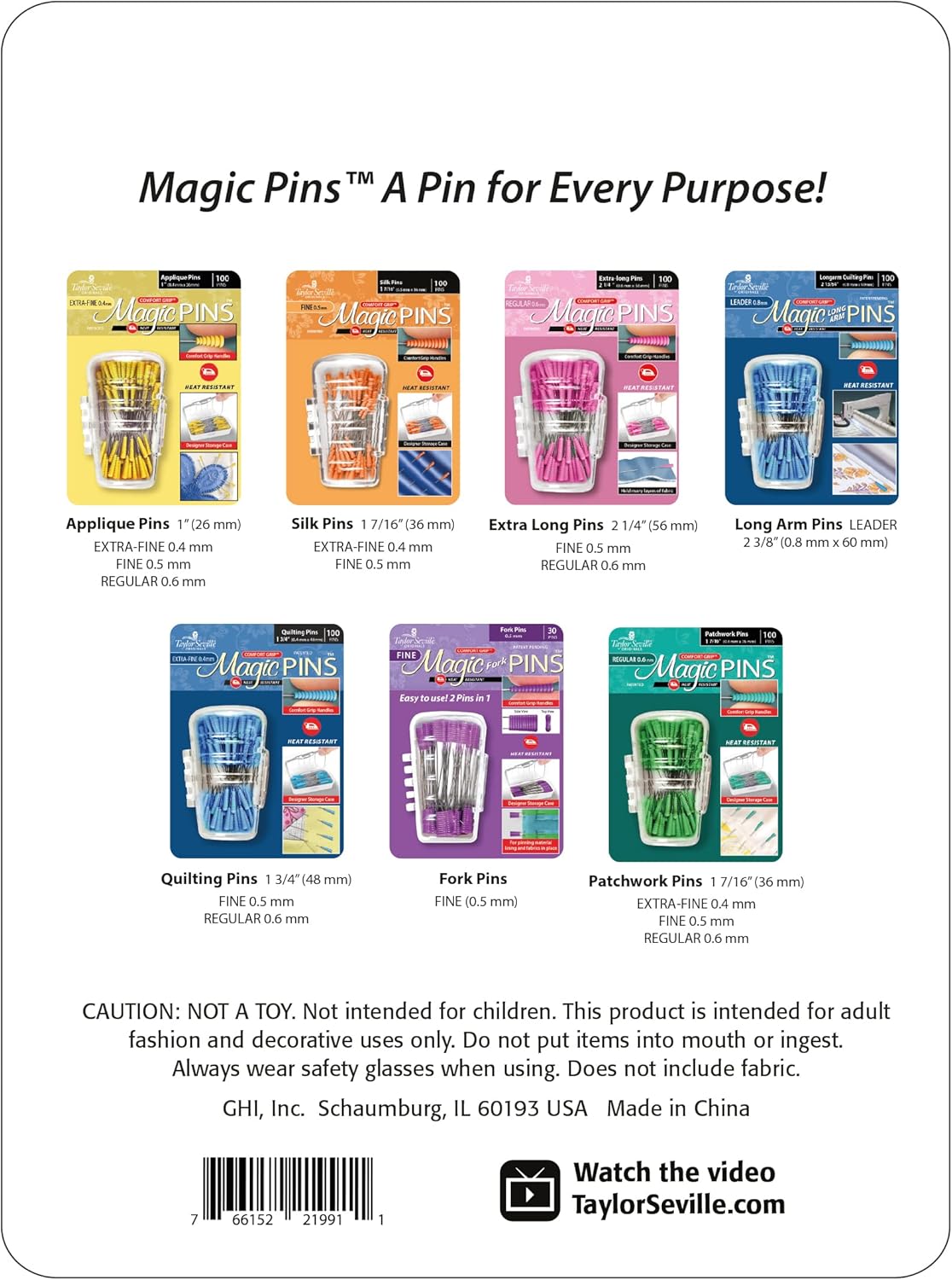 Comfort Grip, Heat Resistant, 100pc. Taylor Seville Originals Notions make your sewing life easier. The Comfort Grip Magic Pins Flat Head Extra Fine are 0.7mm. They have a comfort grip flat head that makes picking up and maintaining a grip on the pin, easy. These are strong and sharp pins which are ideal for multiple layers of fabric. The Comfort Grip Flat Head Magic Pins are also heat resistant, so if you iron over them, they will not be ruined. The pins come in a designer storage case that closes, so you won’t lose any pins!