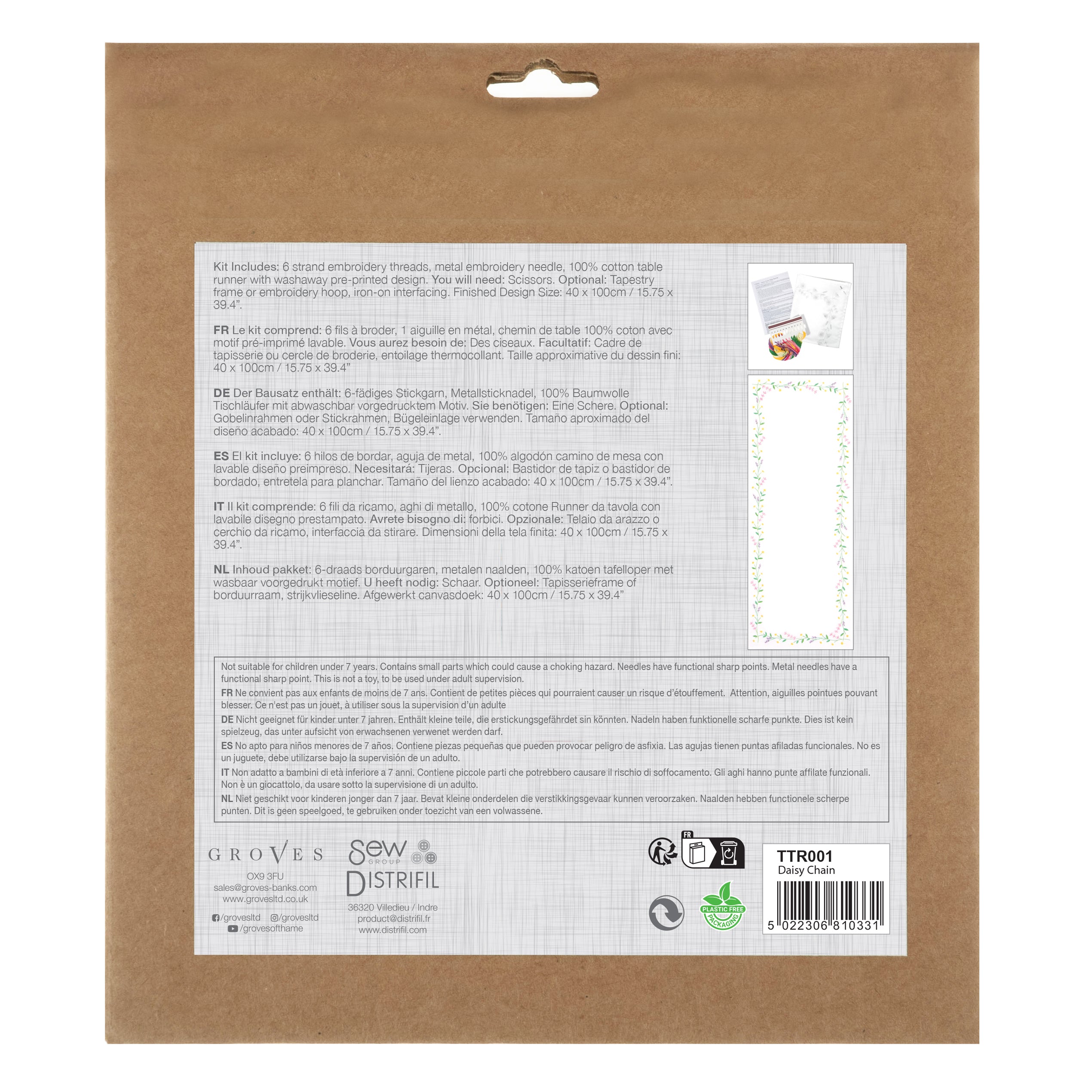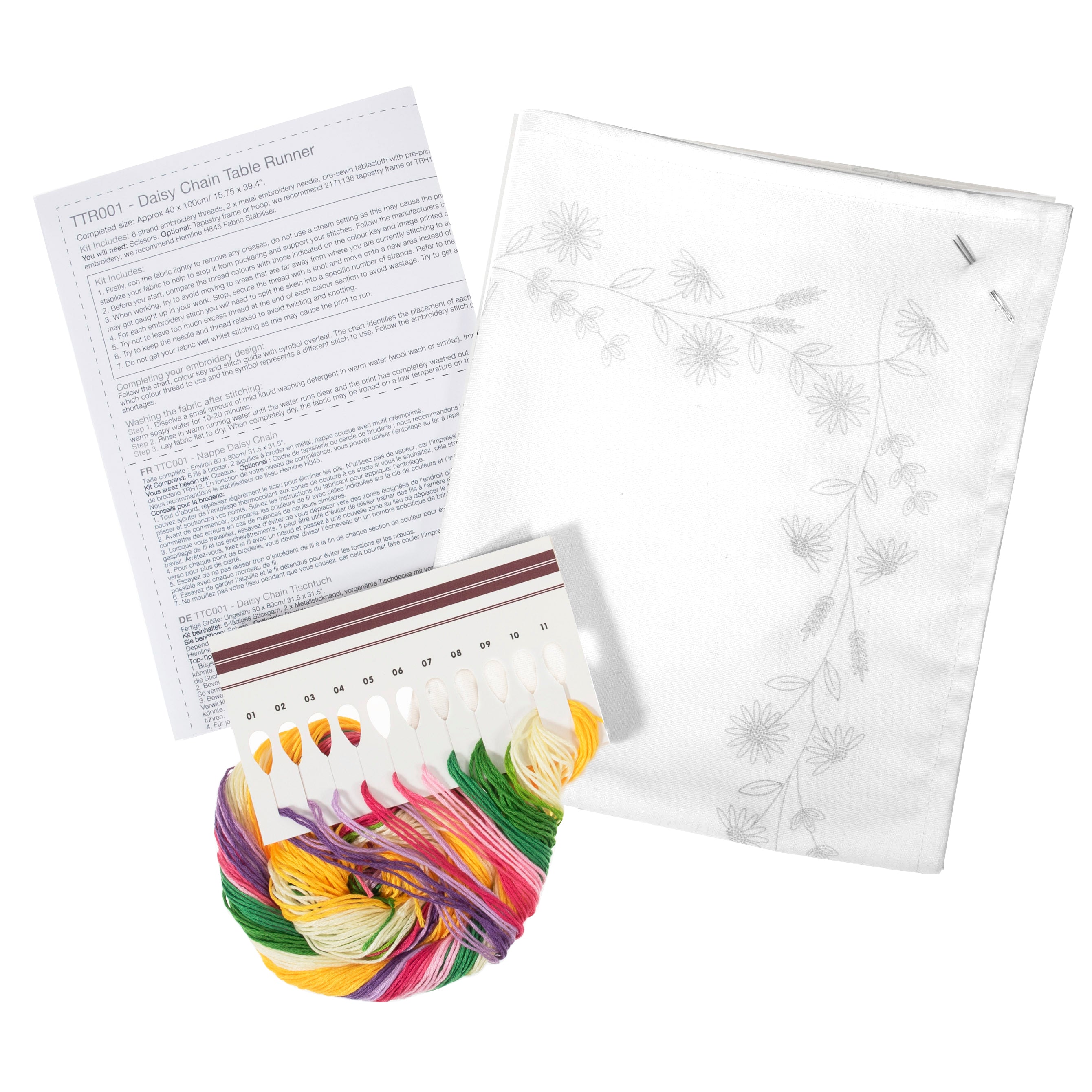 - Pre-printed embroidered table runner. Kit includes: full colour instructions, 6 stranded embroidery threads, 1 x metal embroidery needle, 40 x 100cm pre-printed, premium quality, cotton table runner and instructions in 6 languages (ENG/FR/DE/ES/IT/NL). Finished table runner size: (w/h) 40 x 100cm. After stitching, the table runner is hand washable in warm water using a neutral detergent. Dry flat. Do not tumble dry.