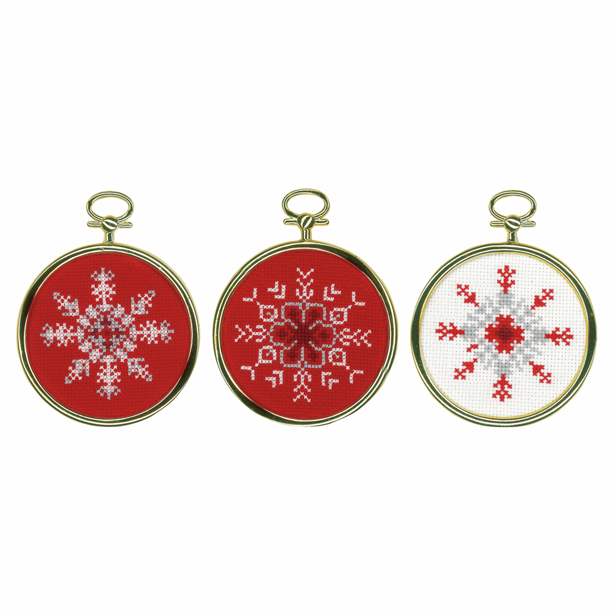 - Design to be stitched with cotton pre-sorted threads onto 18 count, white and red, cotton aida fabric. Kit also includes: large-square charted design; needle; golden, plastic frames; front sheet picture and instructions in 8 languages. Approximate finished size: 7 x 7cm or 2.8 x 2.8in. Age category: from 10 years. Stitches used: cross stitch, long stitch, back stitch.