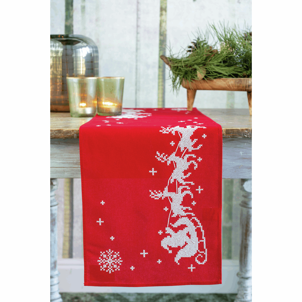 - Design to be stitched onto pre-finished, printed, red, cotton embroidery fabric with hemmed inwoven border, with cotton pre-sorted threads. Kit also includes instructions in 8 languages, large-square design, needle, front sheet picture. The printed design will wash out. Approximate finished size: 30 x 105cm/12 x 42in. Age category: from 9 years. Stitches used: cross stitch, stem stitch.