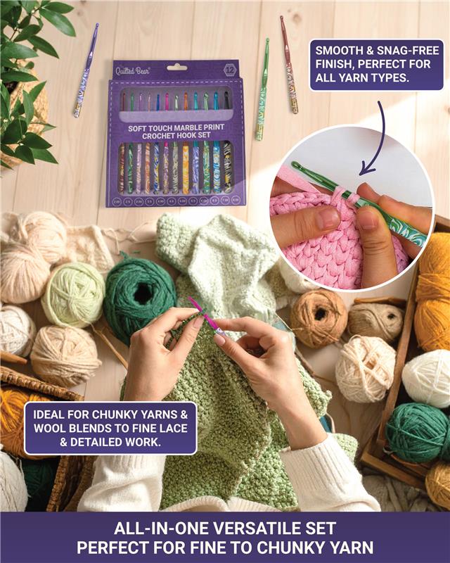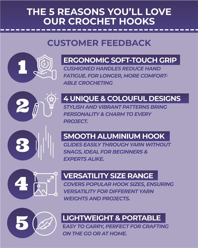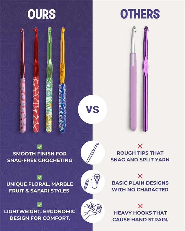 - Our ergonomic crochet hooks fit perfectly in the hands of right and left handed users alike.