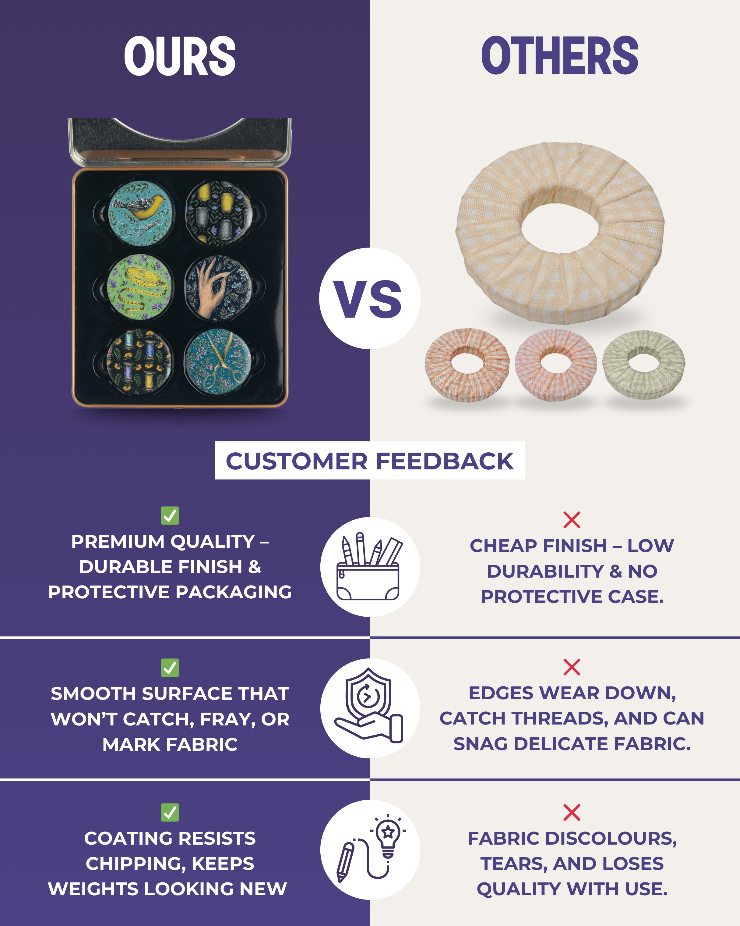 Ideal for quilt patterns, dressmaking, and general sewing projects, these fabric weights keep materials secure and integrate seamlessly into any sewing kit.